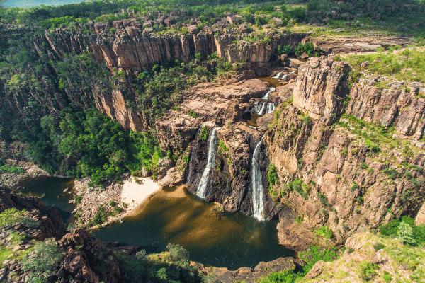 Twin Falls ranks among the most visited falls in Kakadu National Park, and it’s easy to understand why. Two immense falls cascade 150 meters down the cliff face into a deep pool. During the dry season, you can swim right under the falls and in the pool below. For experienced bushwalkers, a hike to the top of the falls is essential. After a tiring walk, the plateau boasts a collection of pools where you can enjoy a refreshing dip. The views here are extraordinary. As you cool off in the pools, you can witness the dizzying descent the water takes before reaching the deep pool below.